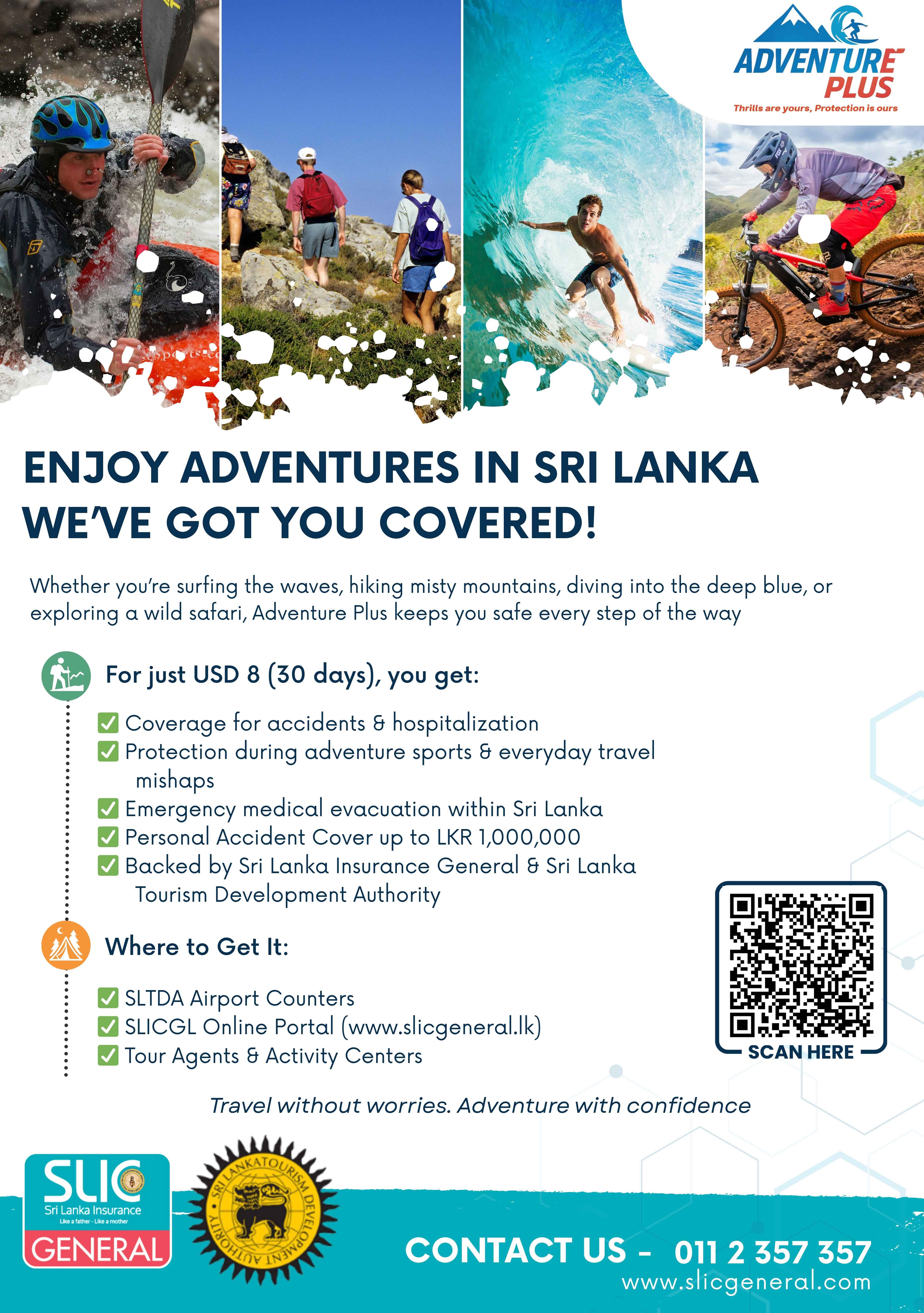 In collaboration with the Sri Lanka Tourism Development Authority, Sri Lanka Insurance General (SLIC GI) is pleased to introduce Adventure Plus – Personal Accident Cover for Tourists.